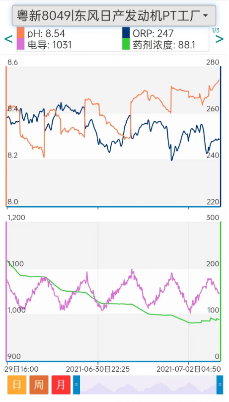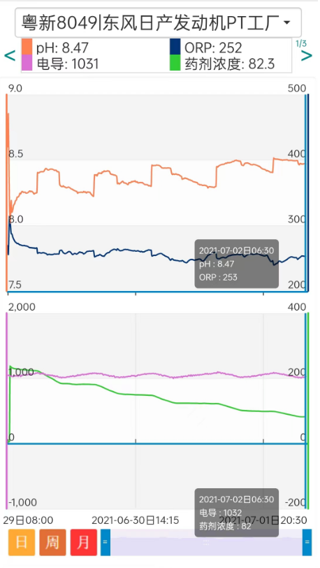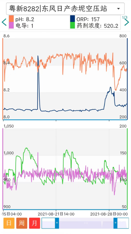 以下是正常使用熒光示蹤加藥設(shè)備后的水質(zhì)變化曲線,可以看到在半個(gè)月的時(shí)間里該系統(tǒng)的電導(dǎo)率和藥劑濃度都控制得非常好。