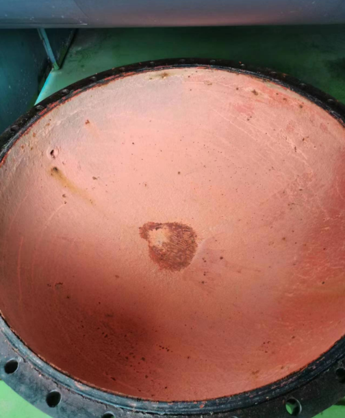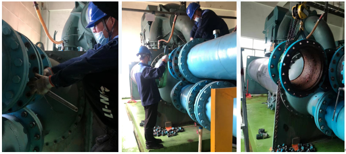 由于該制冷機(jī)已經(jīng)使用了18年左右,很長時(shí)間沒有檢查冷凝器的進(jìn)水端,因此本次對(duì)冷凝器的進(jìn)水端管路法蘭進(jìn)行拆卸,以檢查進(jìn)水端的腐蝕情況。